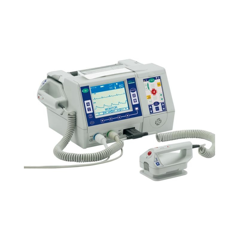 - ECG monitoring with paddles or patient cable. Integrated thermal printer.