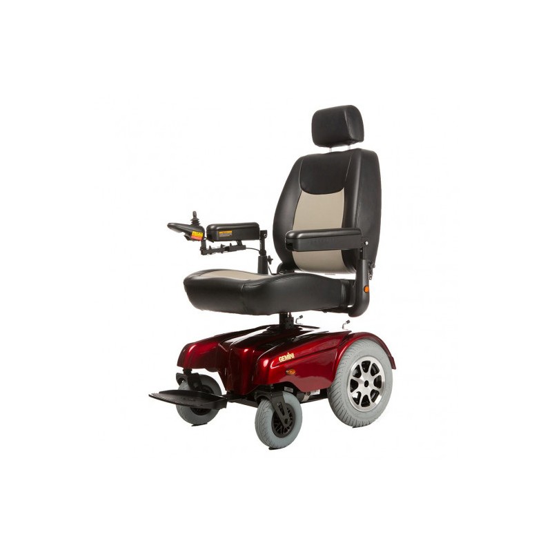 The Merits Gemini Power Wheelchair is a power base rear wheel drive that features a unique suspension system and high-density foam seat that provides a smooth and comfortable ride. Its sophisticated controller coupled with 14" aluminum cast drive wheels offer excellent maneuverability. The comfortable 22" wide captain seat has swivel and folding capabilities with adjustable head and backrest. Aluminum footplate with flip-up height and angle adjustability provides various comfort positions. It has a programmable controller with a wide range of selections to suit the needs and demands of different users.
